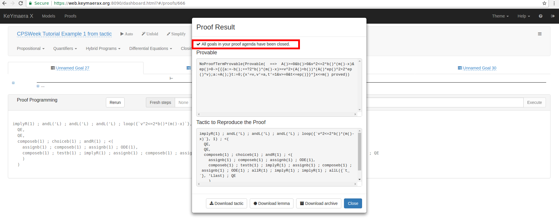From this model dialog, you can re-run the author’s proof using the “Prove with Associated Tactic” button at the bottom of the screen. Loading the proof may take a while. If the proof is successful, then you should be re-directed to a page that contains a modal dialog that looks something like this: